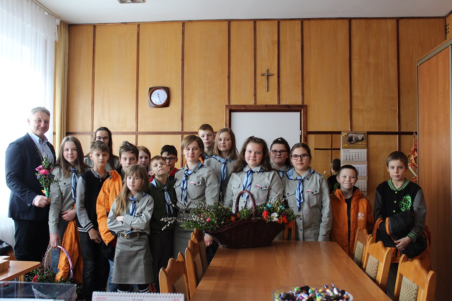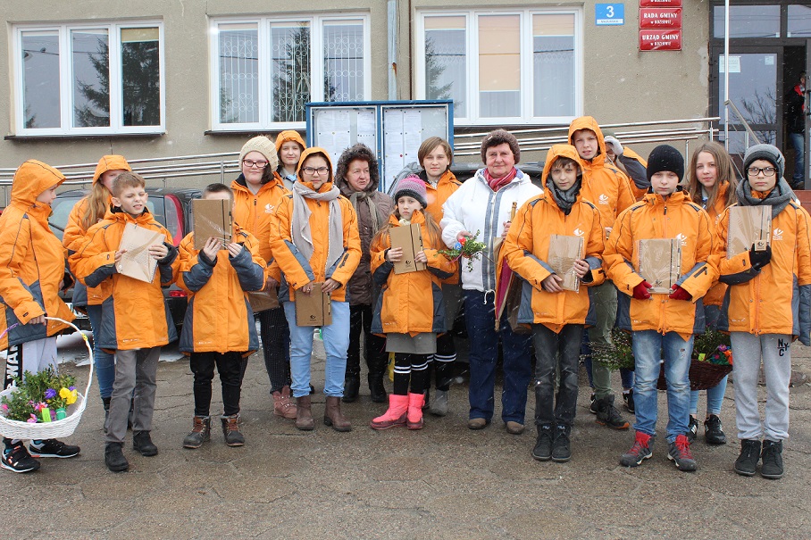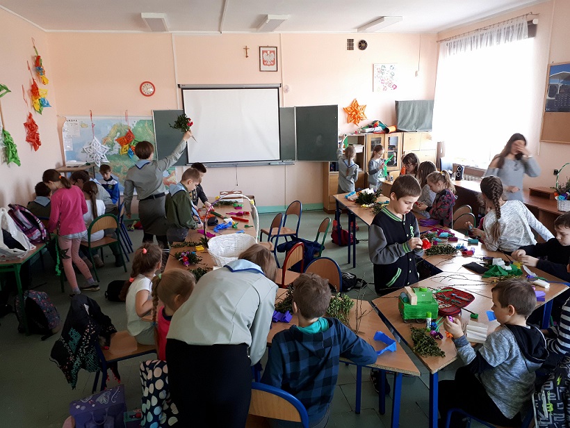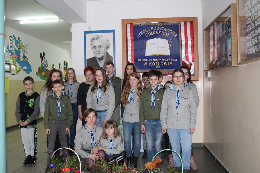 Pielęgnujemy tradycjeUczniowie, nauczyciele, i rodzice Zespołu Szkolno – Przedszkolnego wzięli udział w akcji „Pielęgnujemy tradycje”. W dniach od 14 do 23 marca 2018r. cała szkoła zaangażowała się w zbieranie bazi, bukszpanu i wykonywanie ozdób do palm wielkanocnych. 21 marca odbyły się warsztaty, na które zgłosiło się ponad 30 osób od klasy 1 szkoły podstawowej po klasy gimnazjum. Każdy mógł wykonać dla siebie palmę, którą zaniesie do kościoła w Niedziele Palmową. Harcerze działający przy ZSP Kozłowo wykonali 37 palm, które zostały rozdane 22 marca na terenie Kozłowa. Przechodnie byli bardzo pozytywnie zaskoczeni. Każdy otrzymał palmę oraz został poinformowany, że akcja ta jest kolejnym punktem do uzyskania przez szkołę certyfikatu „Szkoły Wiernej Dziedzictwu”. Akcją naszą pochwaliliśmy się również w wielu instytucjach. Byliśmy w Urzędzie Gminy gdzie przyjął nas Wójt Marek Wolszczak, w GOPS u kierownik Elżbiety Świgoń, w GCKiS u dyrektor Małgorzaty Krzyżewskiej, w Banku Spółdzielczym u Dyrektor Danuty Szymańskiej, w Gminnej Bibliotece, w ośrodku zdrowia, w Gospodarstwie Rolnym u państwa Kwiecień. Spotkaliśmy również dzielnicowego pana Przemysława Rychcik. Palma została również przekazana do kościoła w Kozłowie do proboszcza Andrzeja Chędoszko. Ogromne wsparcie w akcję od pani Dyrektor Barbary Szczepkowskiej przyczyniło się do rozpropagowania akcji. Już wszyscy wiedzą, że uczniowie w Kozłowie znają i pielęgnują tradycje.